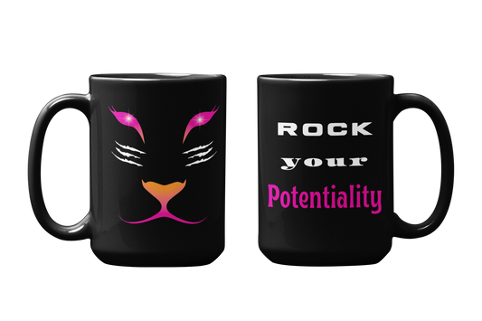 Black Glossy Coffee Mug With Words 'Rock Your Potentiality'. Lioness Face
