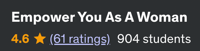 This same course has been rebranded and was called EMPOWER YOU AS A WOMAN, and has over 900 RAVE REVIEWS of 4-5 STARS.Â